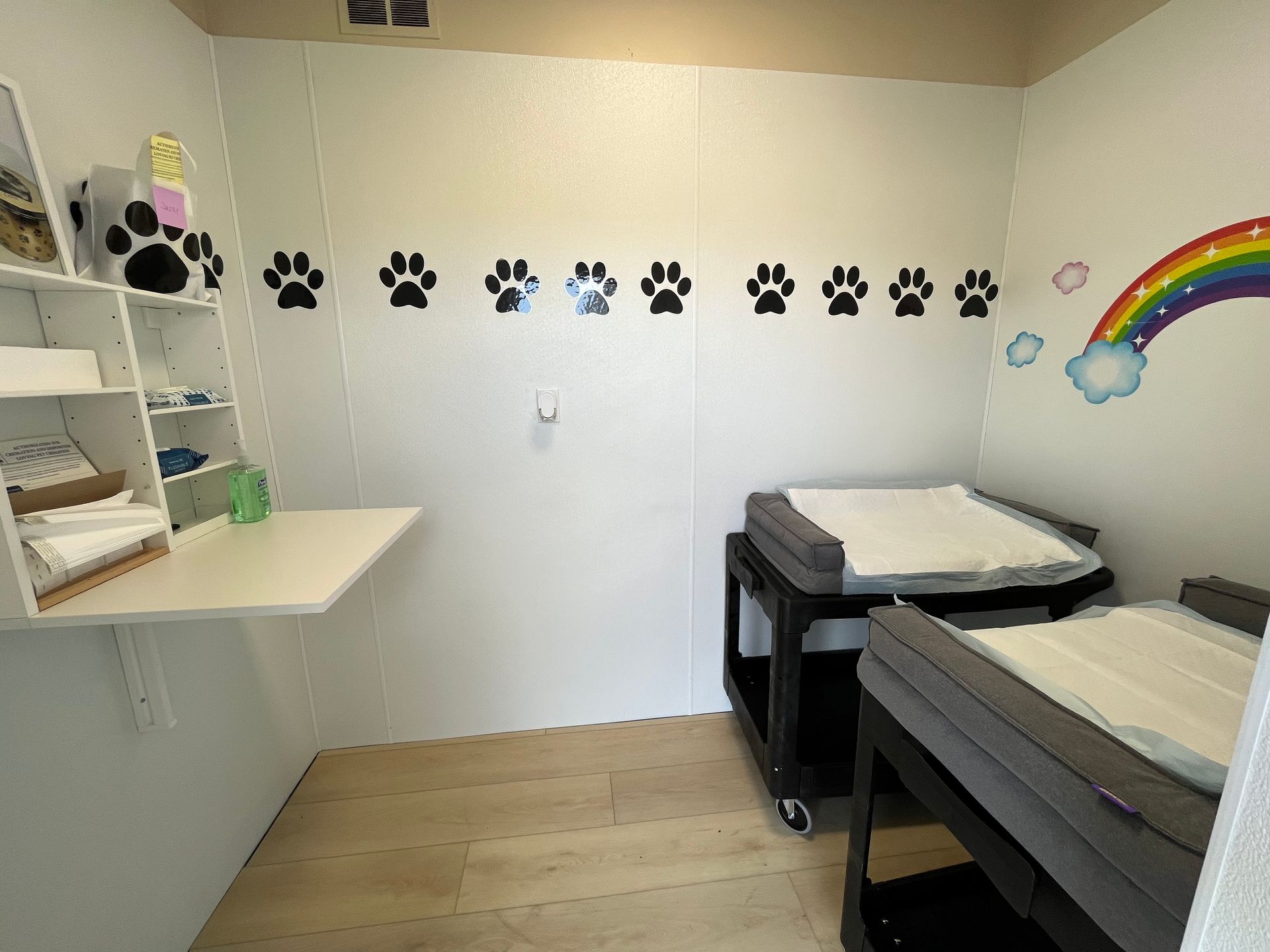 Our temperature-controlled pet rooms are thoughtfully equipped with caring touches, including sturdy carts to assist with your pet, clear check-in instructions, and sanitary supplies should they be needed.